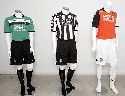 La prima maglia ufficiale del Siena calcio per la stagione 2009 2010 al centro. La seconda maglia del siena a sinistra. La terza maglia del Siena per la stagione 2009 2010 è a destra di colore arancione e nero. Lo sponsor del Siena è Monte dei Paschi di Siena.