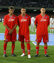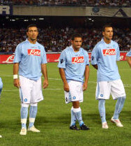 La prima, la seconda e la terza maglia ufficiale del Napoli per la stagione 2009 2010. A sinistra la maglietta classica celeste versione casa, al centro la maglia argentata versione trasferta e a destra la terza maglia rossa. Lo sponsor del Napoli è acqua Lete.